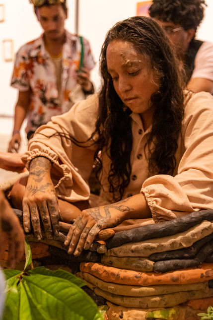 Sentada no concreto, ela desenha a forma de seu corpo, e à margem começa a erguer muros de barro com o público, ali encapsula sementes e restos orgânicos da degustação de frutas, criando assim um volume, uma cartografia coletiva de afetos que são raízes in situ.